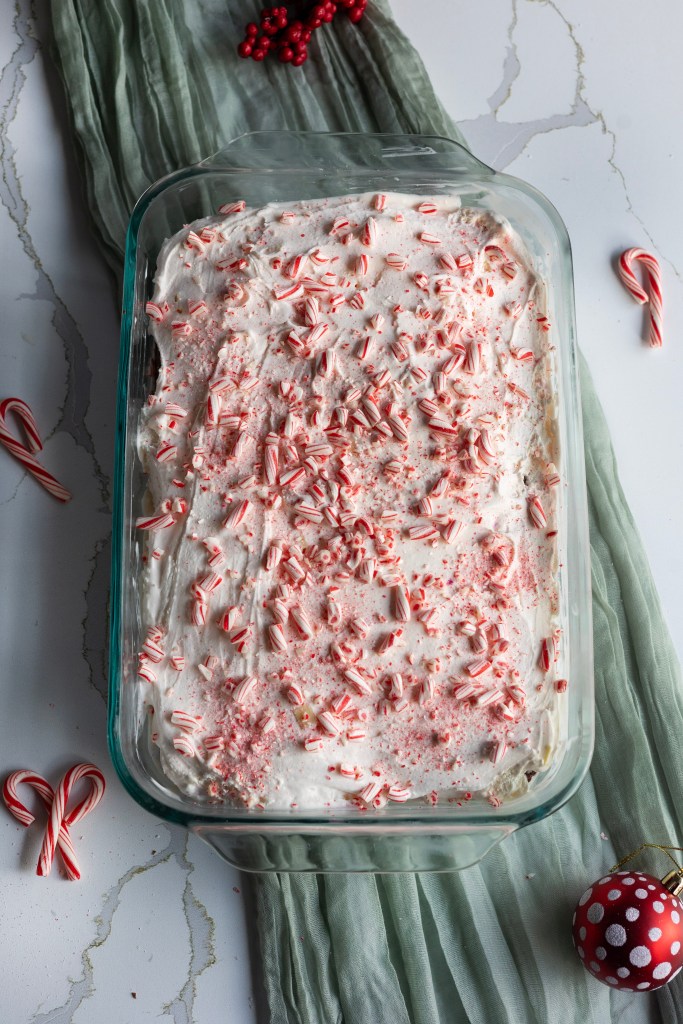 - Pour crushed candy cane on top to garnish.