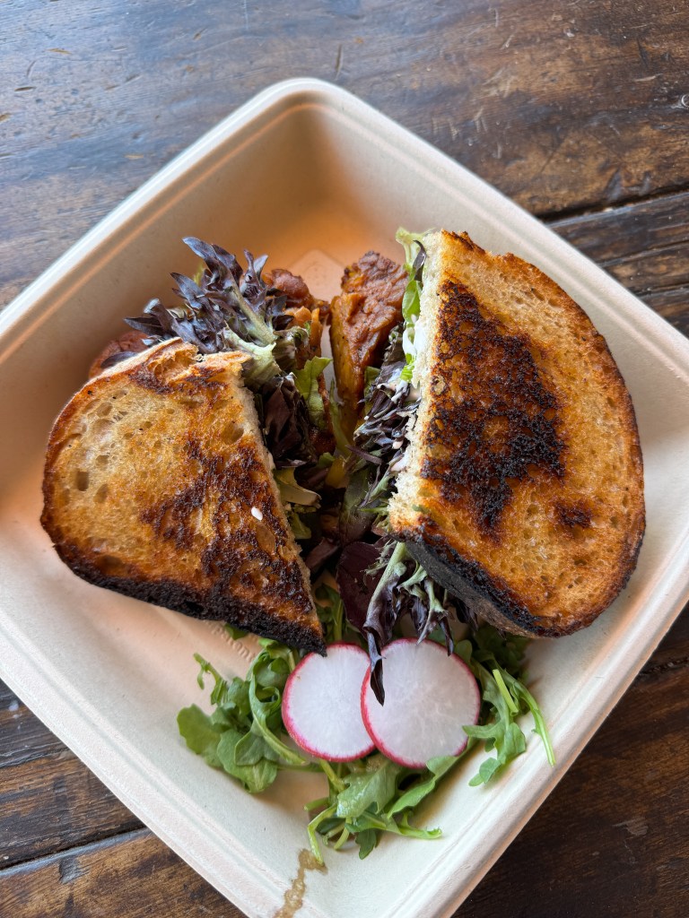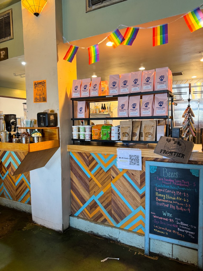 Roadrunner is such a tasty grab-and-go spot right on Park Blvd. It’s the perfect spot to buy some delicious snacks and sandwiches for your Joshua Tree adventure. I tried the Tortoises Delight Sub, which was incredible! It’s stuffed with tomato, red bell pepper, Boars Head cheddar and provolone, spinach, cucumber, lettuce, jalapeño chimichurri, mayo, mustard, and dijon mustard. I also grabbed a container of vegan chocolate chip cookies, and those tasted out of this world. I truly did not expect a grab and go spot to be so good.
